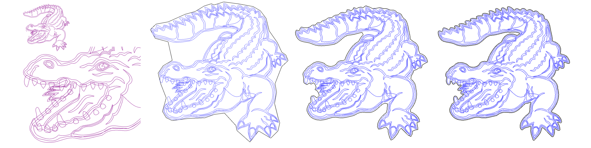 An input (purple and blue) and wrapping results (black). The input is composed of many overlapping polylines, as shown in the head zoom (leftmost).